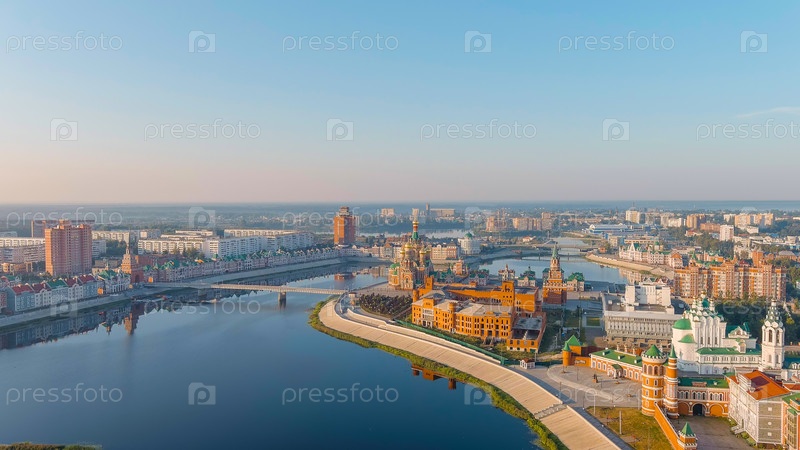 Йошкар-Ола, Россия.Центр города на утреннем свете.Набережная реки Малая Коксага, вид с воздуха