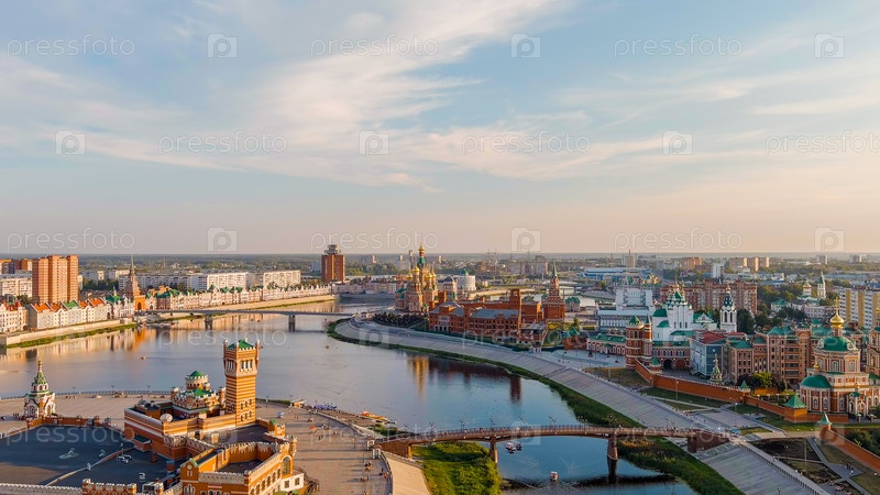 Йошкар-Ола, Россия.Центр города во время захода солнца.Набережная реки Малая Коксага, вид с воздуха