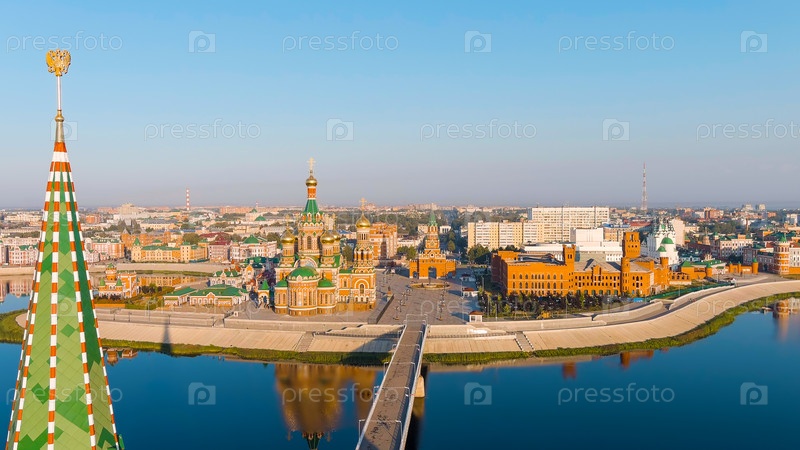 Йошкар-Ола, Россия.Центр города на утреннем свете.Набережная реки Малая Коксага, вид с воздуха
