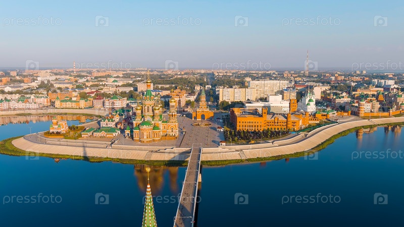 Йошкар-Ола, Россия.Центр города на утреннем свете.Набережная реки Малая Коксага, вид с воздуха