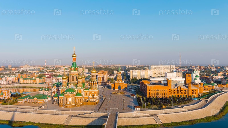 Йошкар-Ола, Россия.Центр города на утреннем свете.Набережная реки Малая Коксага, вид с воздуха