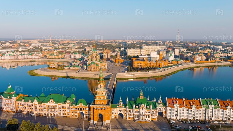 Йошкар-Ола, Россия.Центр города на утреннем свете.Набережная реки Малая Коксага, вид с воздуха
