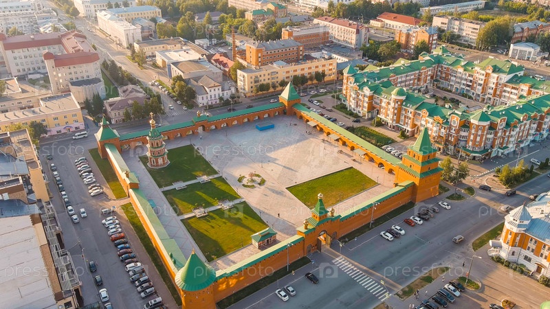 Йошкар-Ола, Россия.Царевококшейский Кремль.В центре города во время заката солнца, вид с воздуха