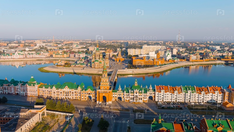Йошкар-Ола, Россия.Центр города на утреннем свете.Набережная реки Малая Коксага, вид с воздуха