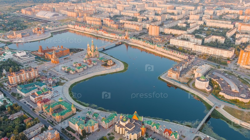 Панорама центральной части города с воздуха во время захода солнца, Аэрофотосъемка