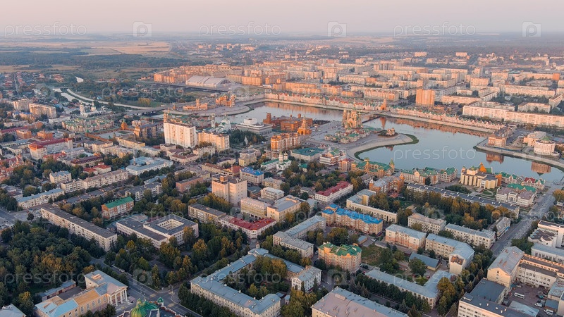 Панорама центральной части города с воздуха во время захода солнца, Аэрофотосъемка