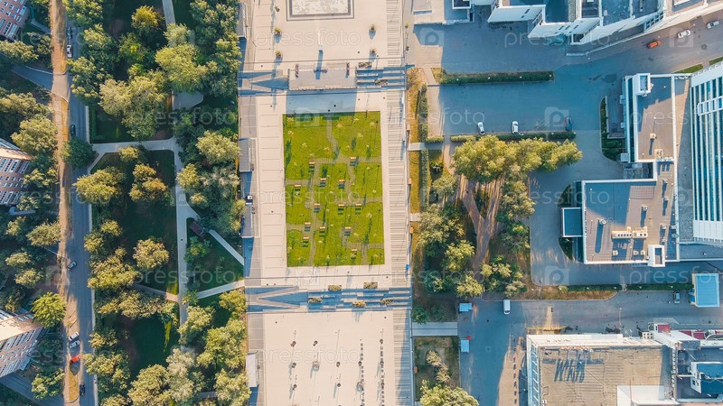 Центральная площадь.Полёт над центром города, взгляд с воздуха, голова над выстрелом