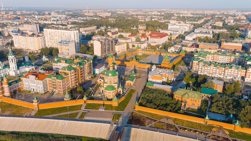 Йошкар-Ола, Россия. Церковь Животворящей Троицы. Собор Воскресения Христова. Царевококшейский Кремль. Утренний свет в центре города, взгляд с воздуха