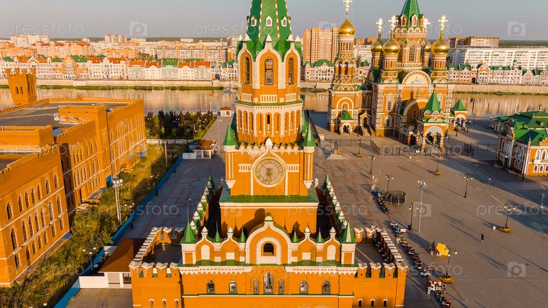 Йошкар-Ола, Россия. Башня Благовещения. Бульвар Чавейна. Центр города во время захода солнца, вид с воздуха