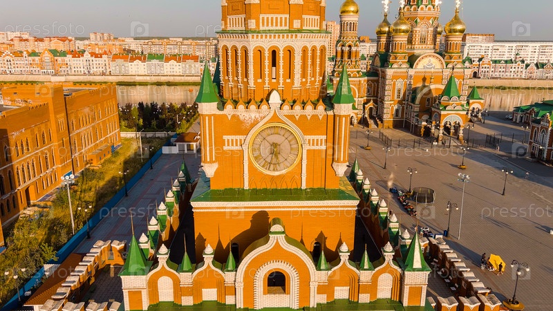 Йошкар-Ола, Россия. Башня Благовещения. Бульвар Чавейна. Центр города во время захода солнца, вид с воздуха