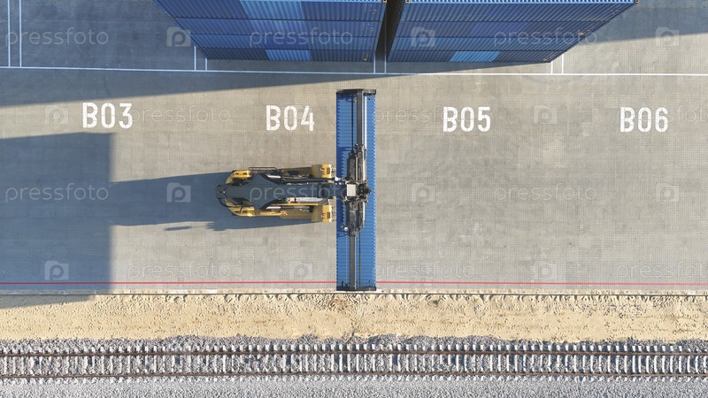 Контейнерный погрузчик поднимает контейнеры на судоходной площадке, с колодой красочных ящиков на заднем плане.Концепция логистики, импорта и экспорта товаров грузоперевозчиками и транспортными компаниями