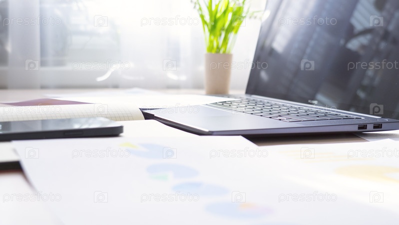 Ноутбук сидит на столе с горшковым растением и кучей бумаг
