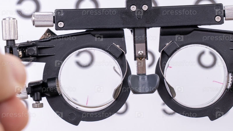Устройство для измерения зрения, контрольная рама, оптометрист и испытательная рамка для проверки зрения.Очки помещаются в тестовую раму для определения отклонения человека видение от нормы
