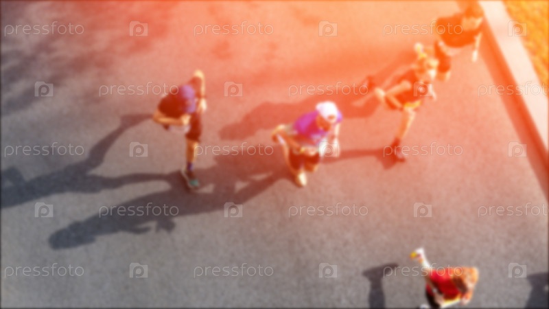 Человеческие спортсмены бегут марафон по улицам города в солнечный летний день с прохладной погодой, участвуя в городских соревнованиях