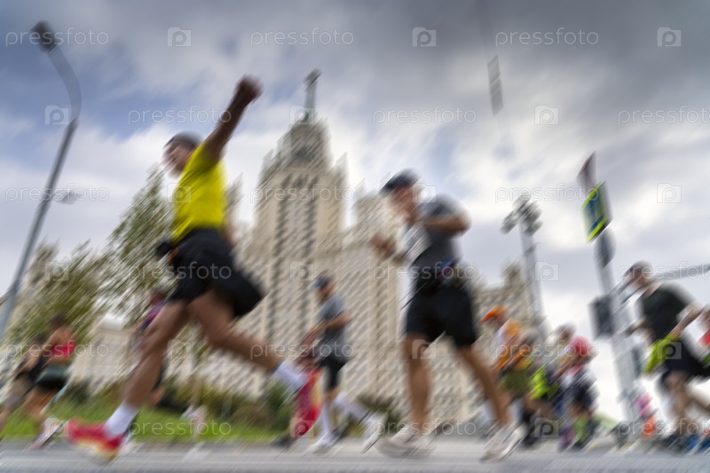 Люди бегут по городским дорогам, участвуют в марафоне