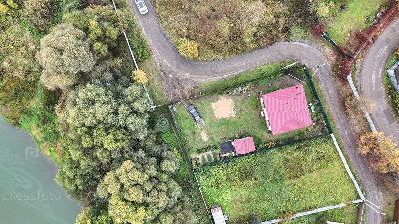 Вид из высоты птицы на пригородный район показывает деревянную жилую улицу в престижном районе.Загородный дом стоит на участке земли недалеко от города, с видом на окрестности