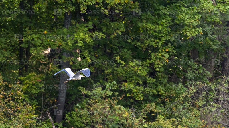 Большой синий гребец в середине полета над спокойной рекой с пышным зеленым лесом на заднем плане в летний день