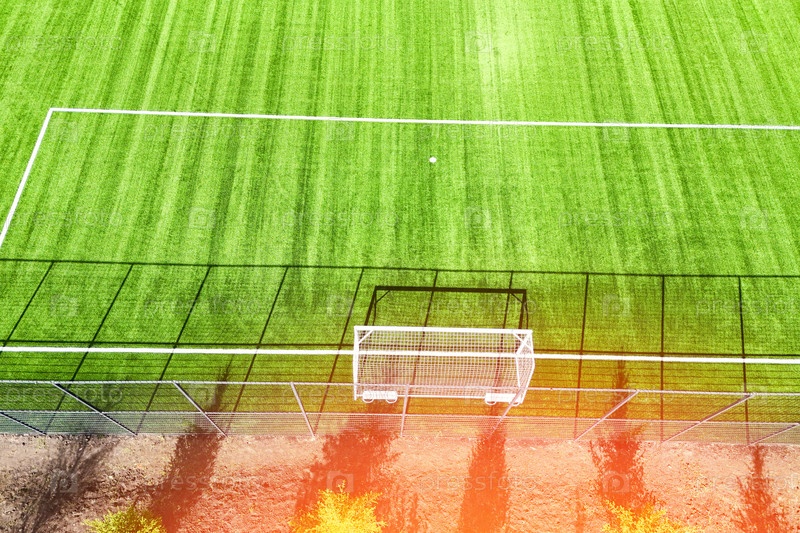 Общий вид футбольного поля, с ярко-зеленой травянистой поверхностью и тибией