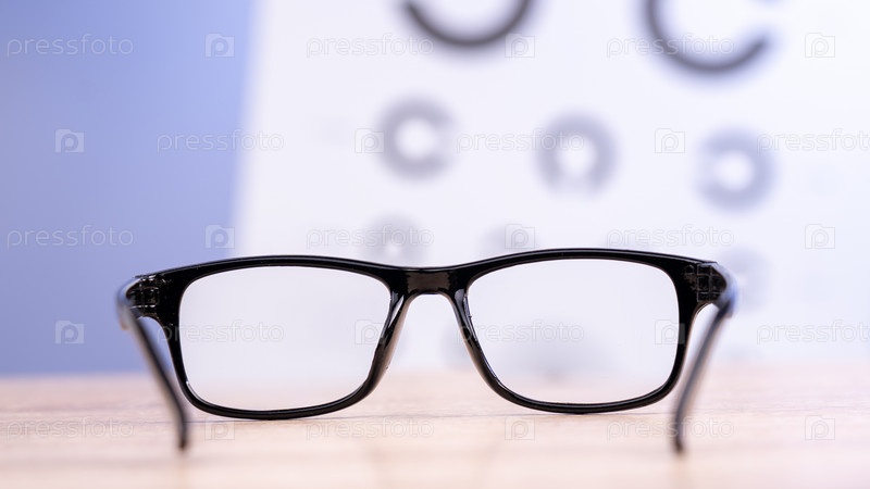 Проверка зрения через очки, с очками на столе и диаграммой проверки зрения на заднем плане.Идея астигматизма и коррекции зрения из-за возрастных изменений