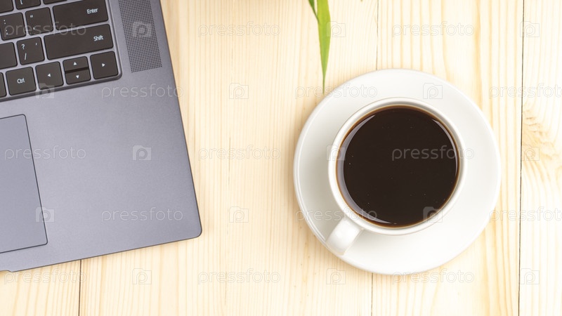 Стол с ноутбуком, чашечкой кофе и солнцезащитными очками расположен на деревянной поверхности. рабочее место. вид сверху с копией зоны
