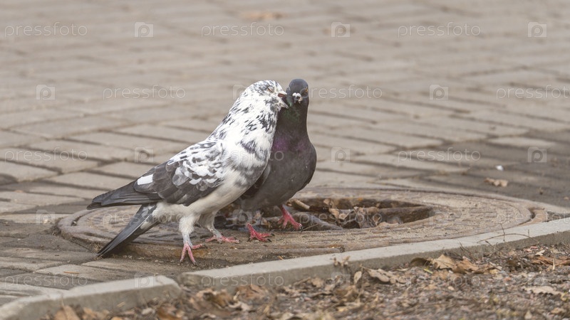 Подробный вид голубя с блестящим оперением и полосками на ногах, прогуливающегося по влажному тротуару
