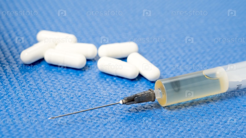 Шприц с желтой жидкостью рядом с кучей белых таблеток