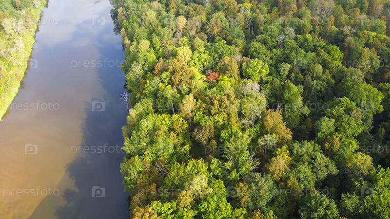 Лес с множеством деревьев. Через лес течет широкая река Деревья зеленые и коричневые. Лес полон жизни. Вид из воздуха на красивый смешанный лес посередине полосы