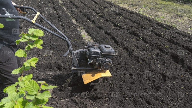 Садовник готовит почву для посадки с помощью культиватора.Это может быть садовый культиватор или вращающаяся фрезерная машина, которая помогает разбить уплотненный грунт и улучшить его структуру и аэрацию.Затем садовник использует культиватор для выращива