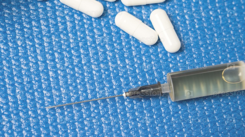 Шприц с белой иглой находится на синей поверхности