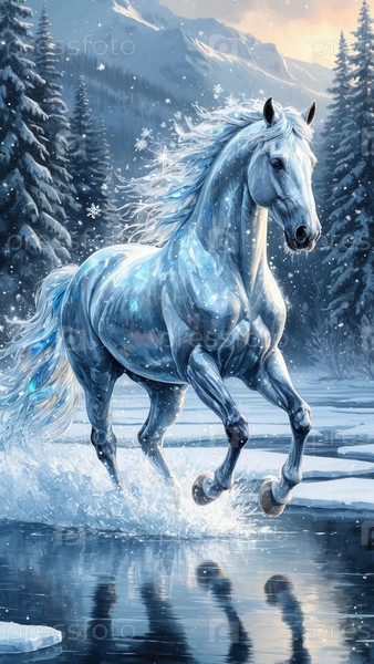 Величественный ледяной конь едет по снежному лесу