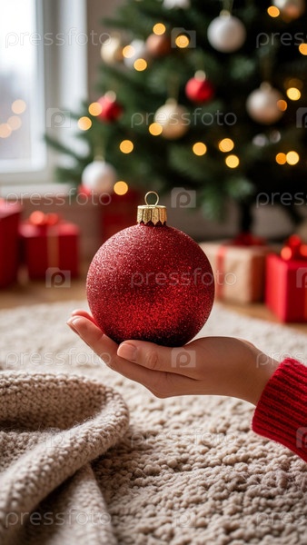Рука держит стеклянный красный шар рождественской елки на фоне элегантной праздничной ёлки, огней и подарков