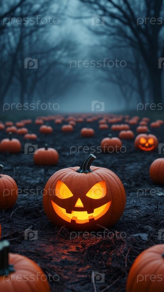 Светящийся тыквенный фонарь в тумане на поле в ночь Хэллоуина