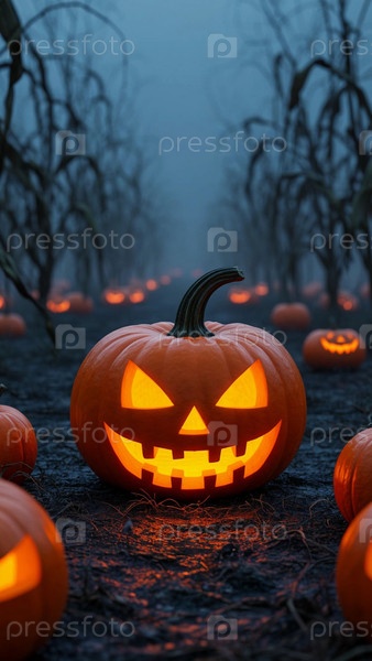 Тыквы светятся на поле в праздник Хэллоуина