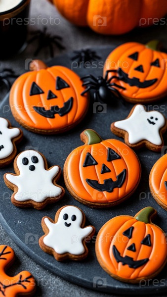 Имбирные печенье в форме тыквы и призраки на Хэллоуин