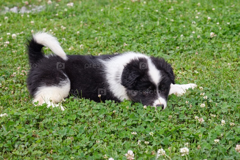 Щенок лежит на траве в саду, это скрещивание Бернского Сенненхунда и Самоеда