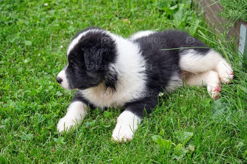 Щенок лежит на траве в саду, это скрещивание Бернского Сенненхунда и Самоеда