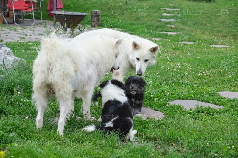 Белая швейцарская овчарка, самоид и ее щенки на траве в саду