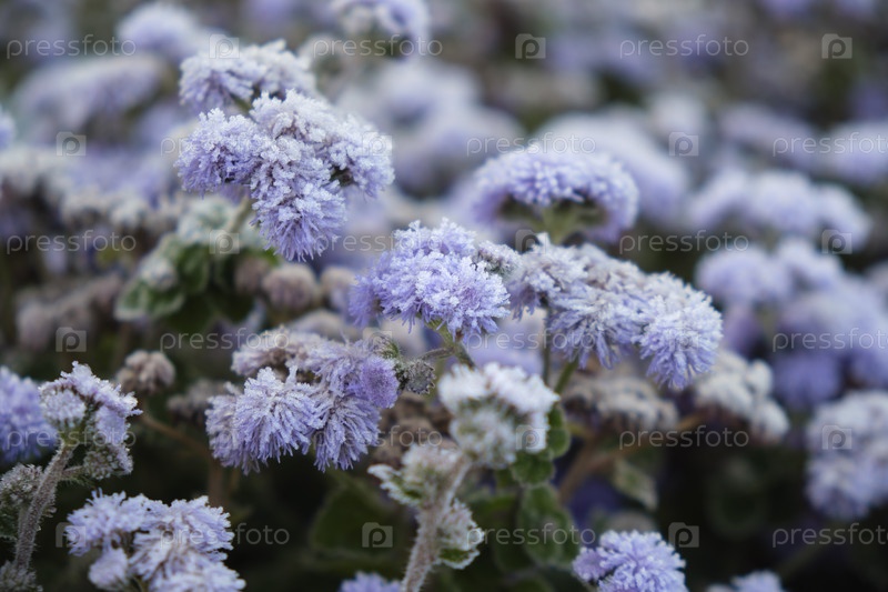 Цветки Ageratum houstonianum покрыты морозом.Мороз в осенний сезон