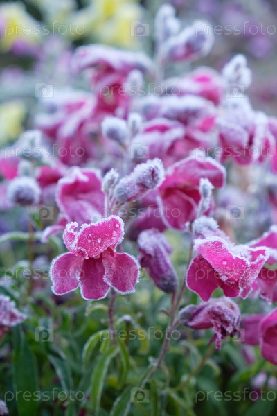 Закройте розовые цветы, покрытые морозом.Мороз в осенний сезон в саду