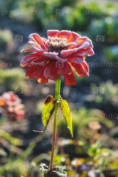 Красные цветы зиннии покрыты морозом.Мороз в осенний сезон