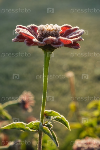 Красные цветы зиннии покрыты морозом.Мороз в осенний сезон