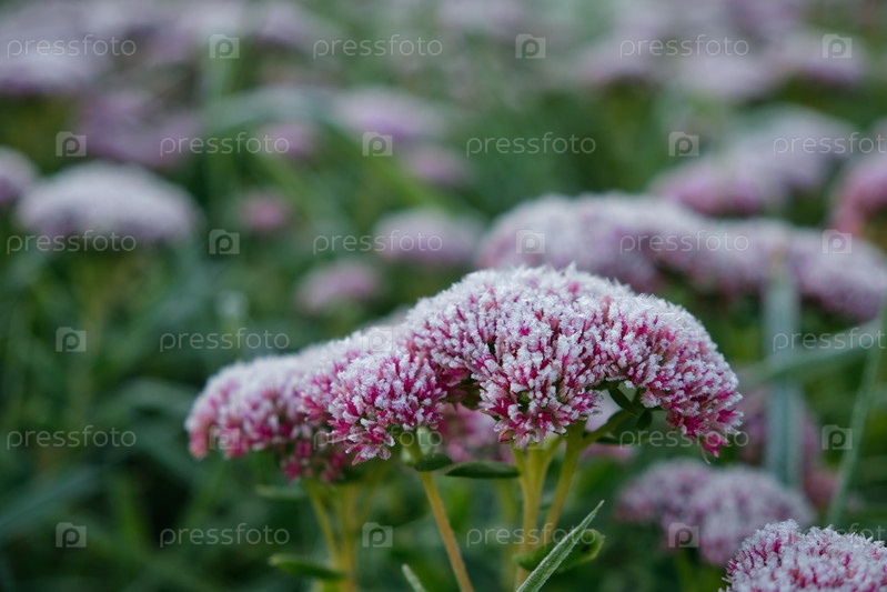Седум - это вид розовых цветов, покрытых морозом.Мрозы осенью в саду