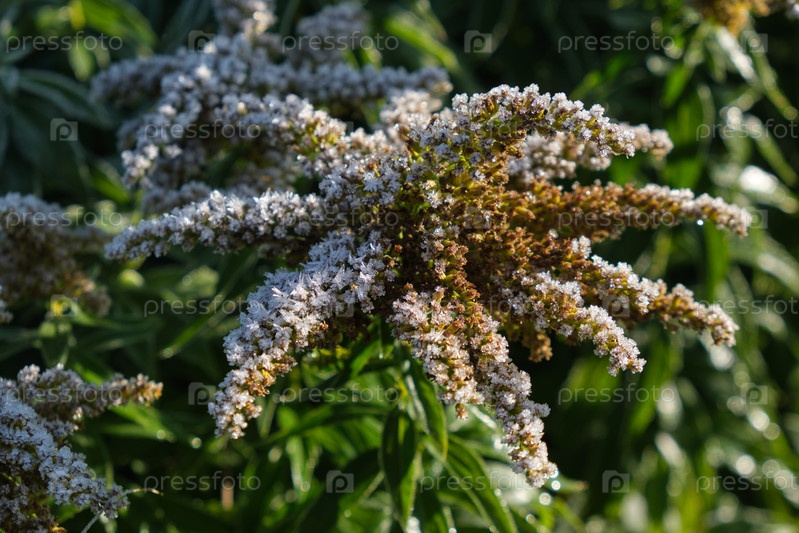 Ближайшие фотографии желтых цветов Solidago canadensis (канадская золотая палочка или канадский золотистый стержень), покрытые морозом