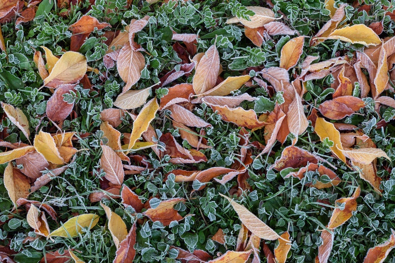Зеленый газон с желтыми осенними листьями после утренней морозы
