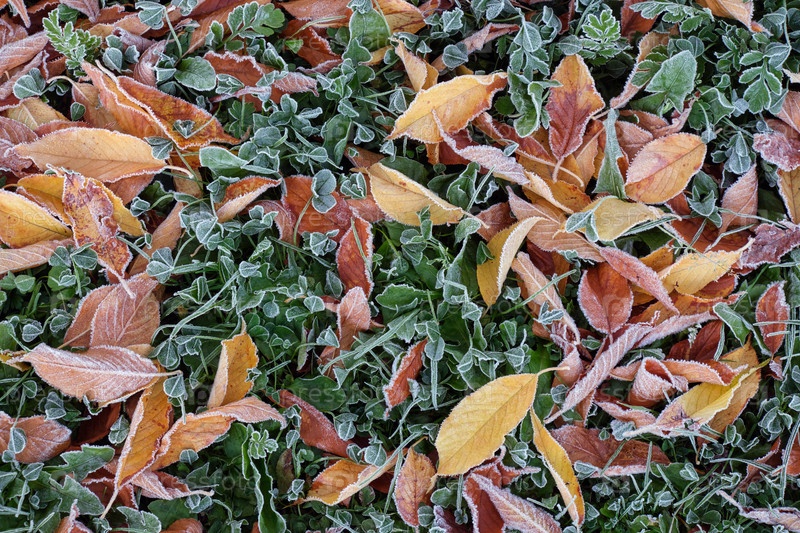 Зеленый газон с желтыми осенними листьями после утренней морозы