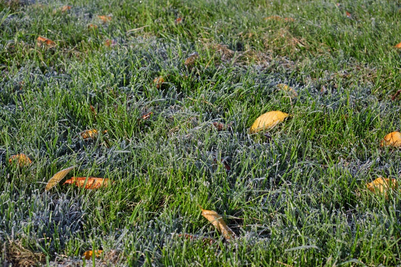 Зеленый газон с желтыми осенними листьями после утренней морозы