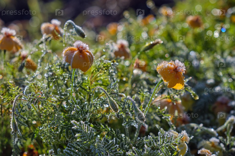 Желтые цветы бархатных вельветов отвергаются, покрываются морозом