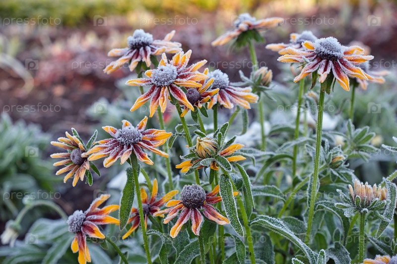 Рудбекия желтые цветы, покрытые морозом. Мороз в осенний сезон в саду