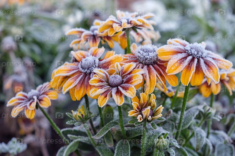 Рудбекия желтые цветы, покрытые морозом. Мороз в осенний сезон в саду