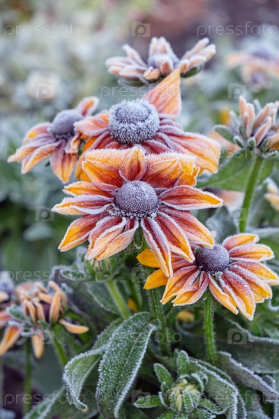 Рудбекия желтые цветы, покрытые морозом. Мороз в осенний сезон в саду